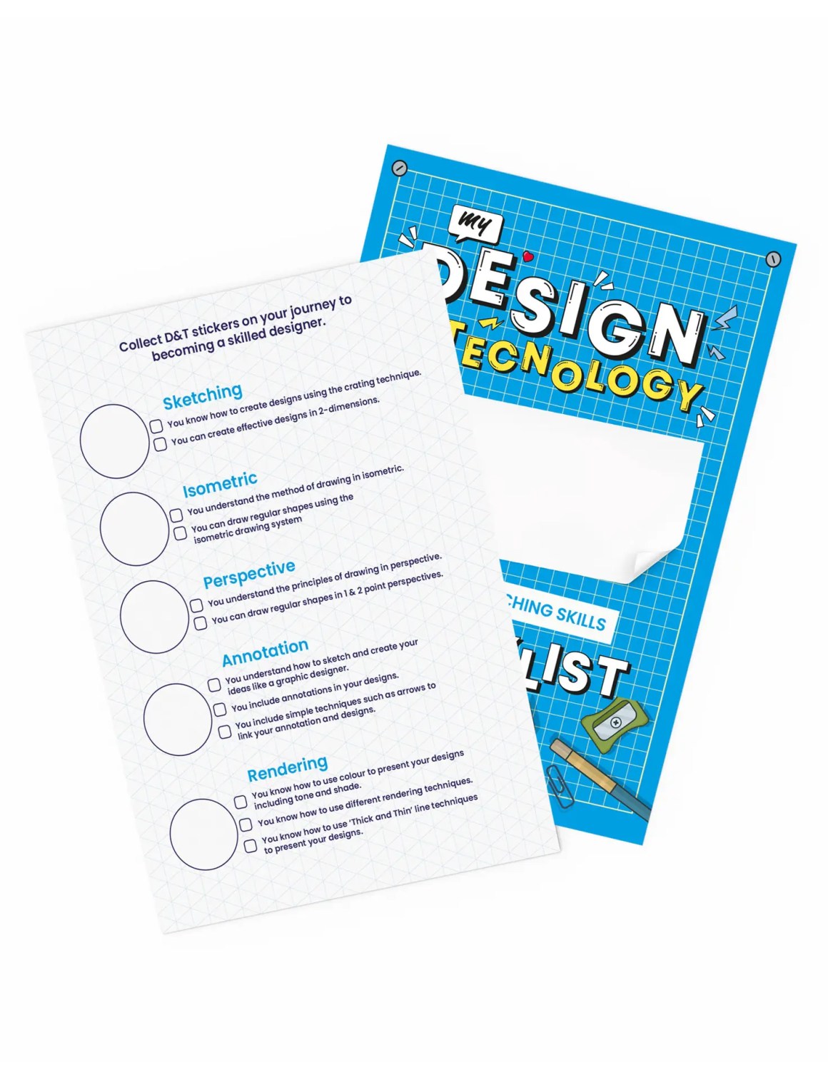 £17.50Introducing the Design & Sketching Checklist – This highly visual and impactful checklist can be used to motivate and reward learners. The checklist allows the teacher to motivate and empower students on their journey to becoming a skilled designer with this handy little postcard and sticker pack. Specific skill stickers can be awarded for subject related skills and students can collect stickers to show progression and attainment. Every pack comes with 40 a5 postcard and 5×40 packs of stickers. Sure to be a big hit with parents too! A very visual indicator of students achievement in the D&T Department!