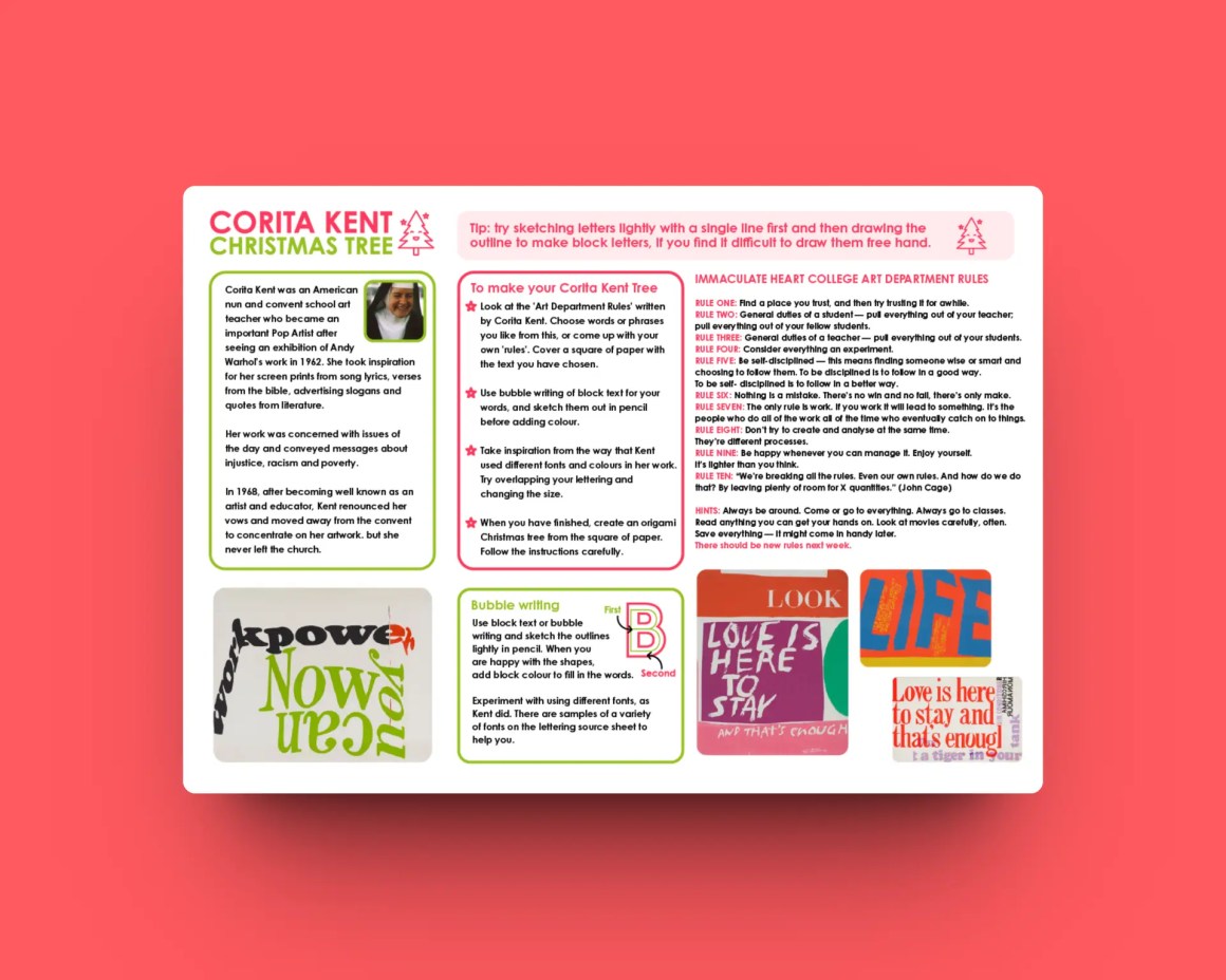 £2.50This handout gives information on the Pop Artist Corita Kent and her background as a educator and nun. Students take inspiration from the style of her text-based screen prints as well as her ‘Art Department Rules’ to create their own origami Christmas Trees from paper. The worksheet gives full instructions and source materials. No specialist materials are required other just scissors, paper, pencil and colours. Corita Kent is an inspiring artist for students to get to know in this fun lesson for the holiday season. There is a video guide to making the origami Christmas Tree in case additional clarification […]