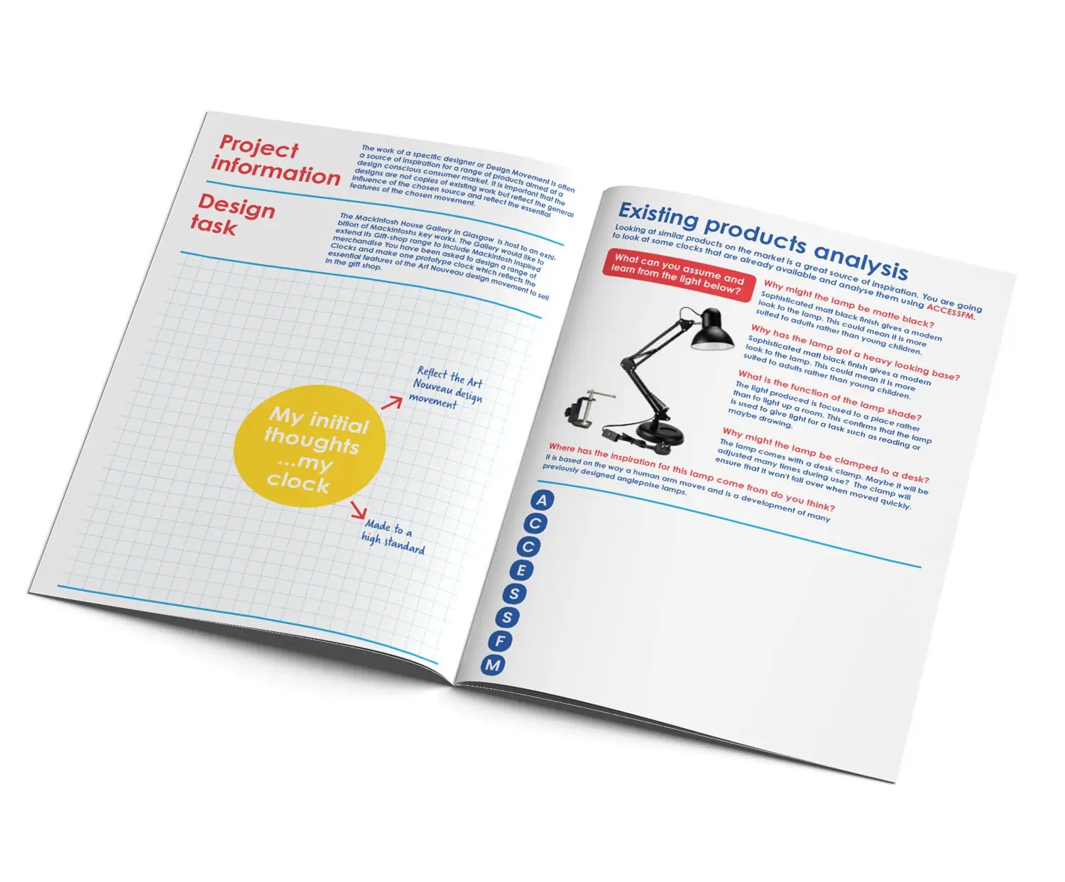 Bonnie’s product design unit : Clocks workbook (28 pages) walks students through the process of creating a unique and inspired clock. Looking at how to come up with ideas and evaluate them using the ACCESSFM process. Available in both black & white and colour downloads.