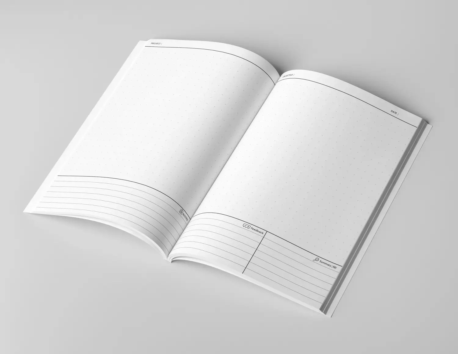 Each a3 spread has space for the Project title, objective, and date, with dedicated space for sketches, notes, feedback, and summary/EBI.