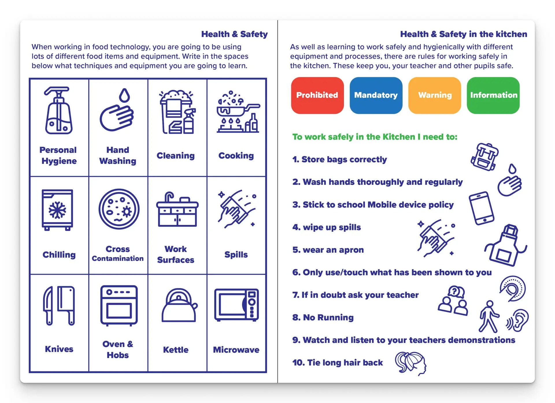 Food Technology Health & Safety Student Workbook – A comprehensive 16-page educational guide for secondary school pupils learning kitchen safety and hygiene.
