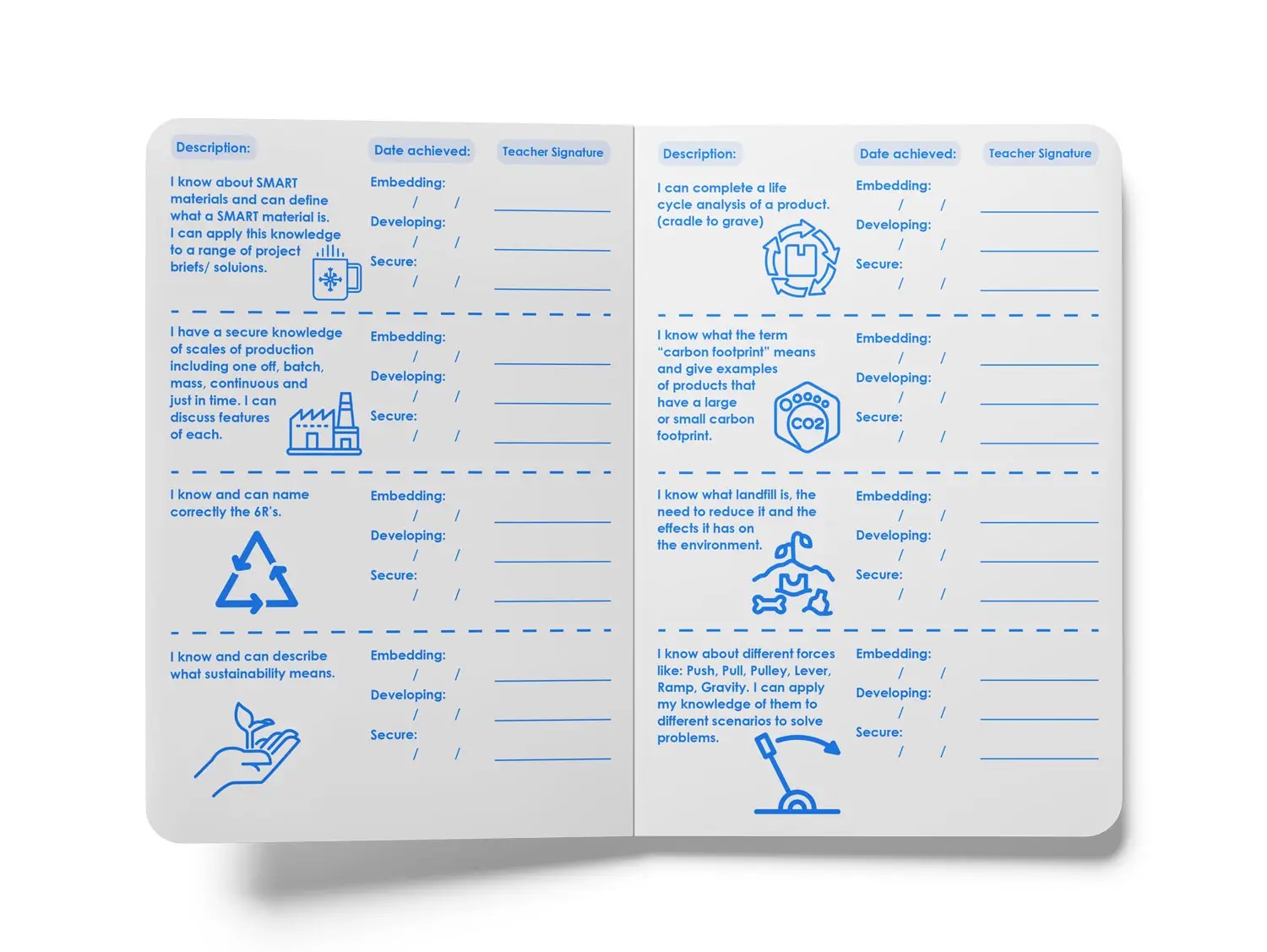 This knowledge and skills passport allows students to track their progress so that they can effectively articulate their learning over KS3. It also allows teachers to track their training on machines and conduct formative assessment. Space is given within the booklet to add more knowledge aspects if required.