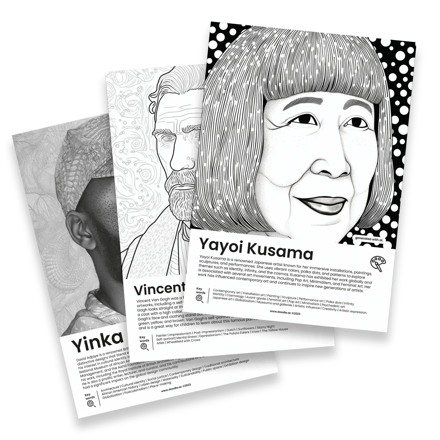 Artists: Yinka Ilori, Vigee Le Brun, Yayoi Kusama, Banksy, Vincent Van Gogh, Leonardo DaVinci, Augusta Savage, Paula Scher, Rachel Whiteread and Esther Patterson