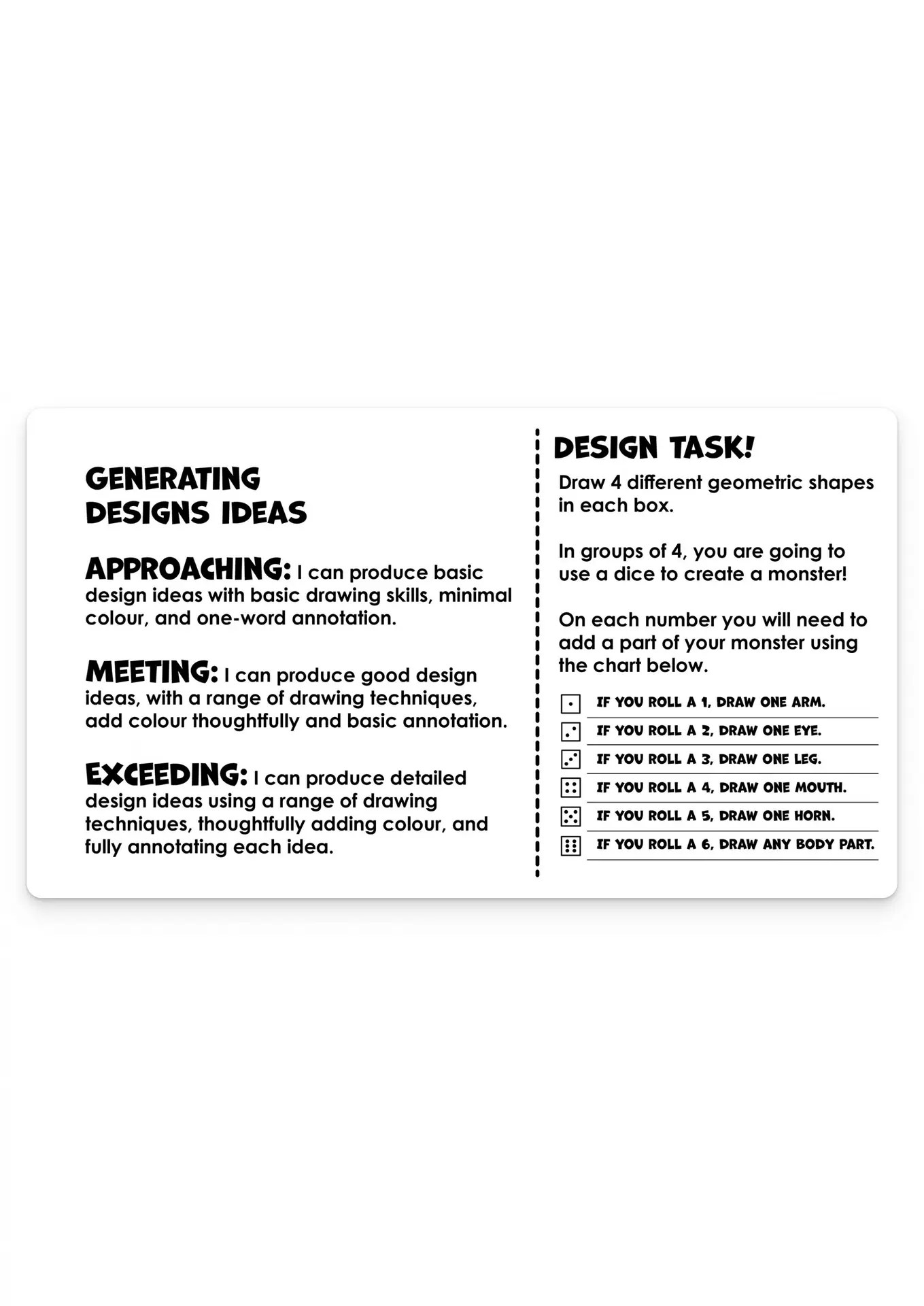 - Design inspiration – Creative activities including dice-rolling design games and annotation examples