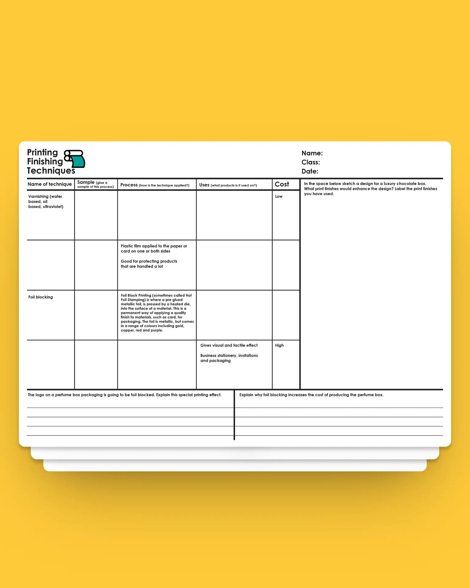 Support students to think through and understand the different print finishes that can be applied to Paper and Boards.