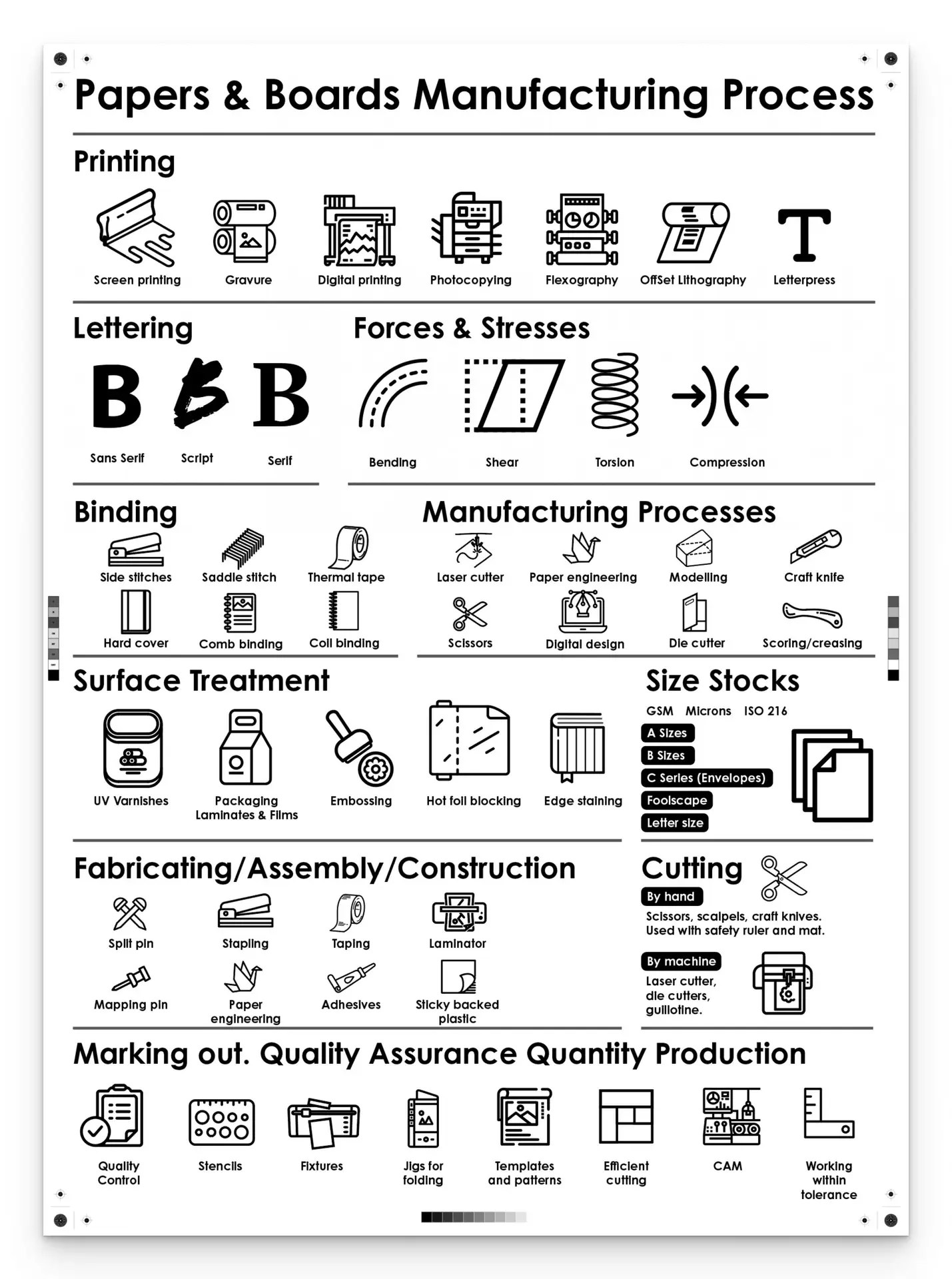 This is large mind map displaying all of the manufacturing processes knowledge related to Papers and Boards (Graphics).