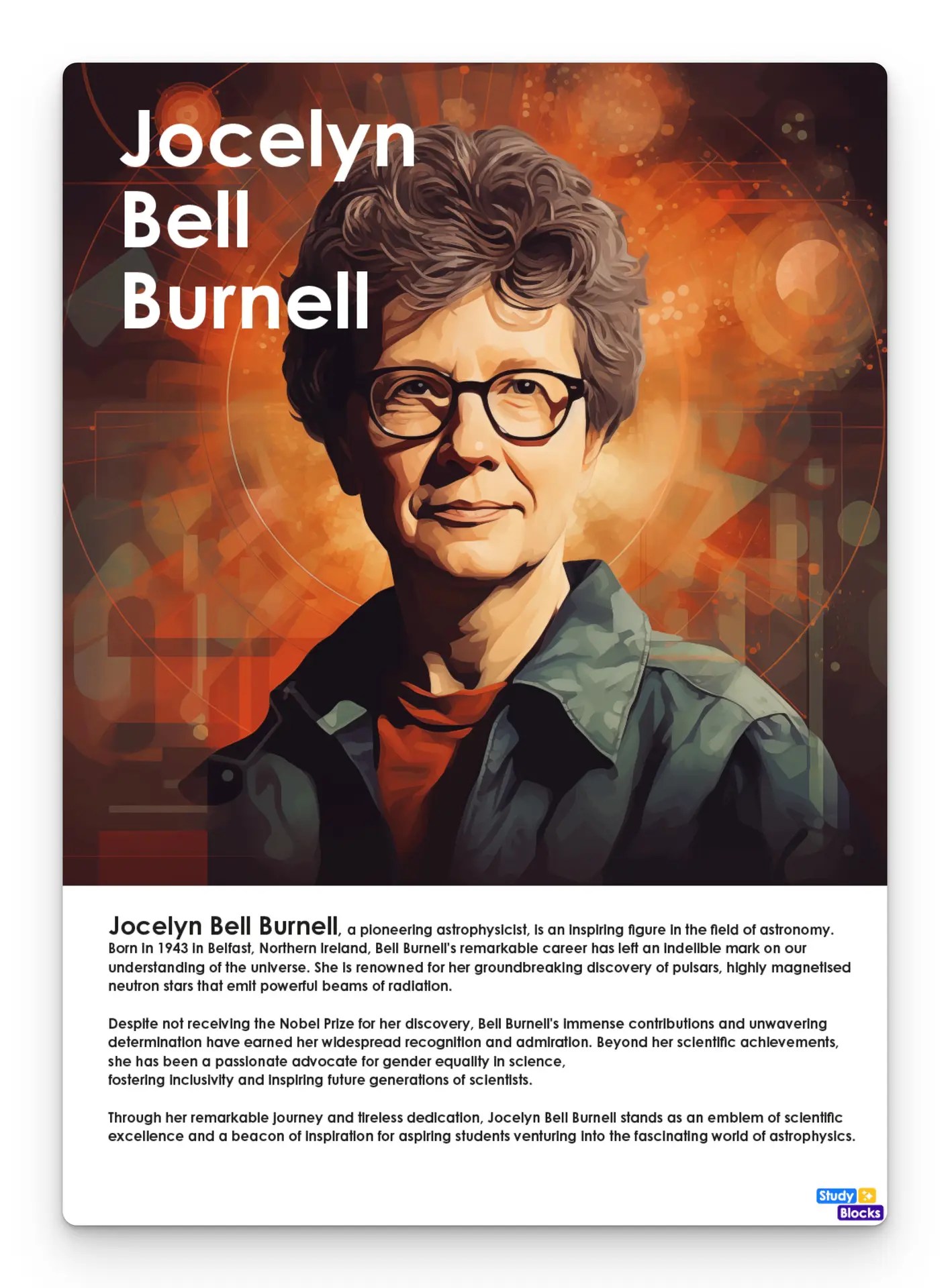 Jocelyn Bell Burnell | Mae Jemison | Albert Einstein | Charles Darwin | Louis Pasteur | Marie Curie | Neil deGrasse Tyson | Jane Goodall