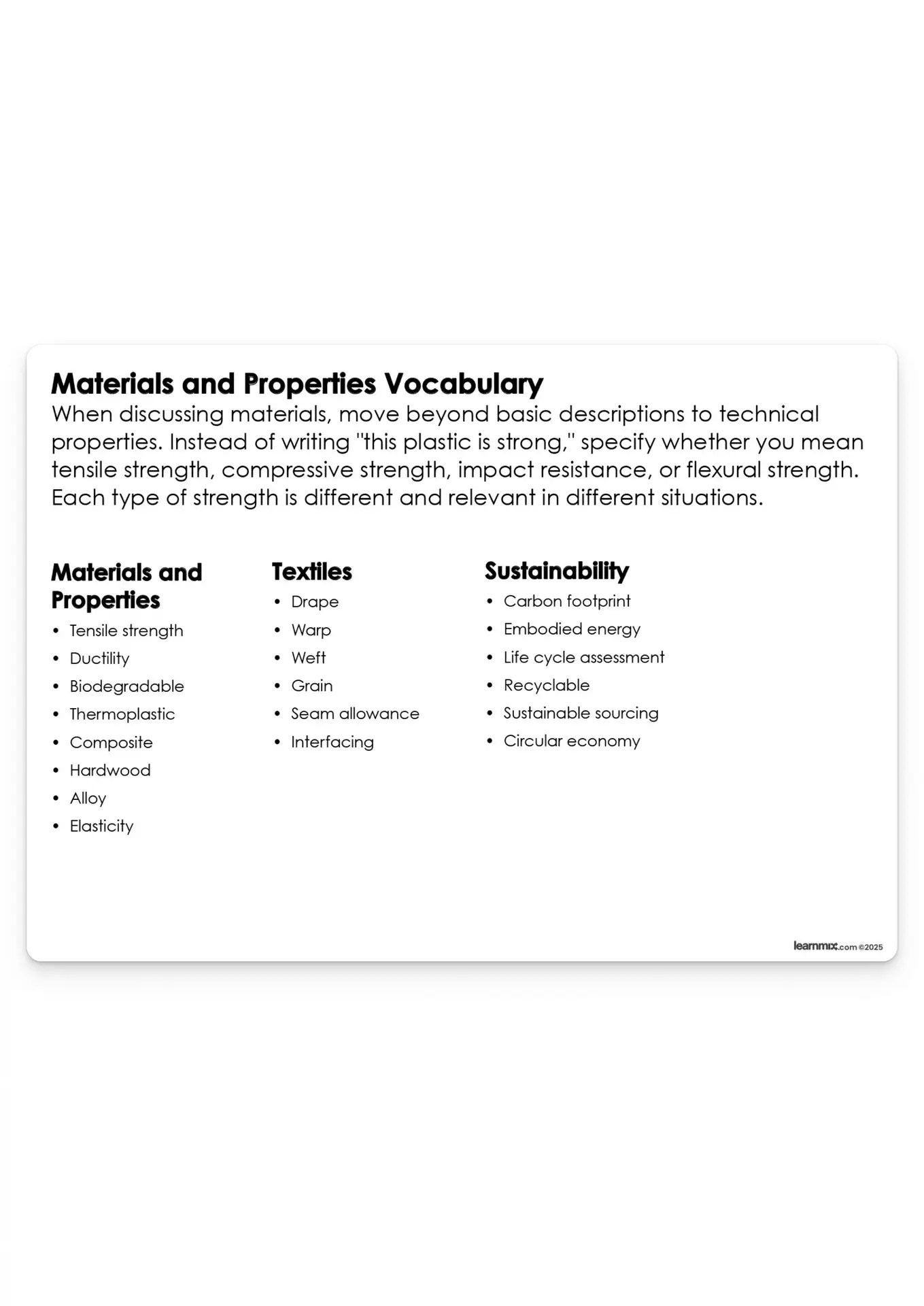 Transform your students’ design communication with this essential vocabulary guide for GCSE Design & Technology. This comprehensive resource helps students move from basic descriptions to sophisticated technical language that demonstrates real understanding.