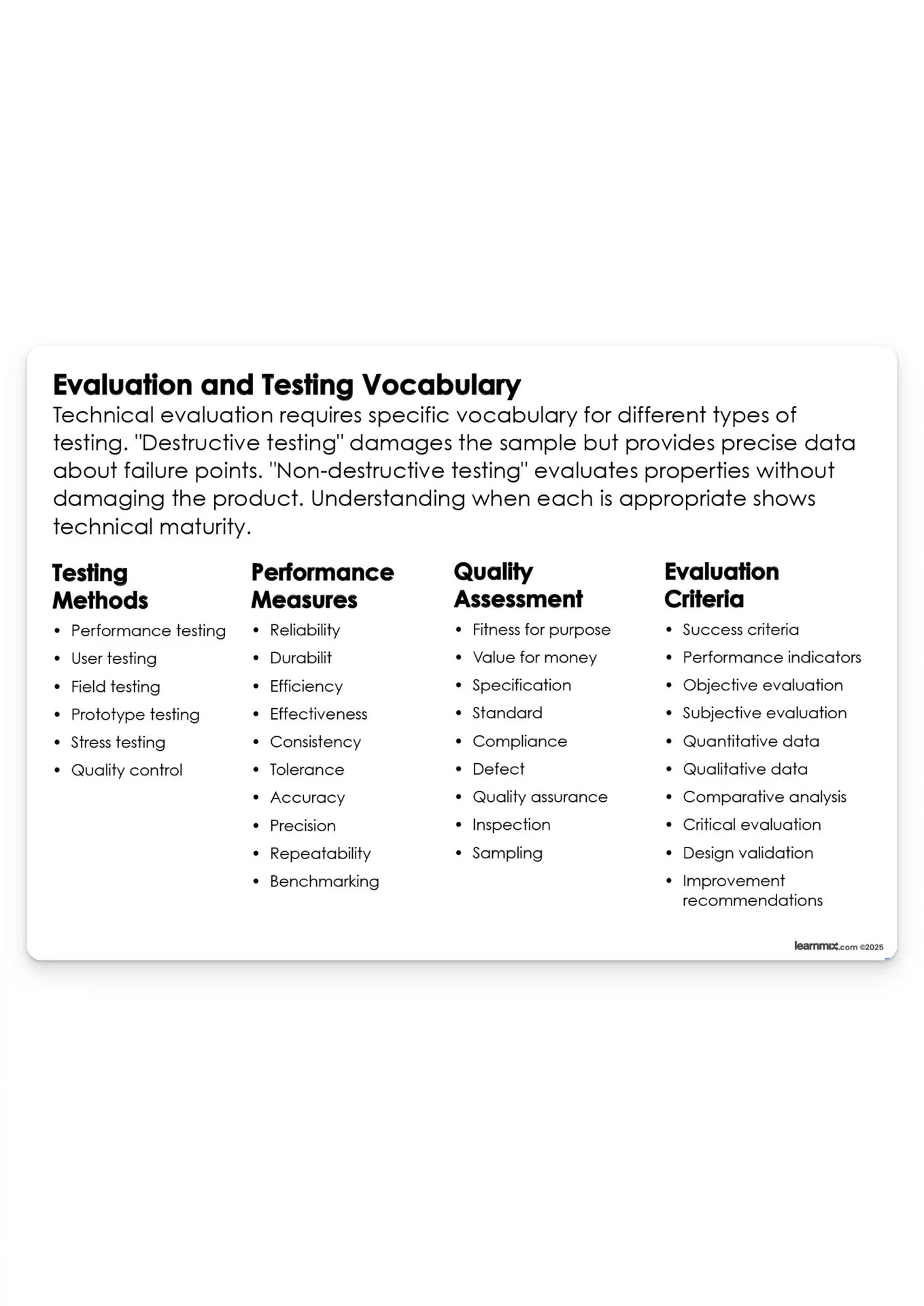 - Evaluation & Testing – Professional vocabulary for assessment and quality control