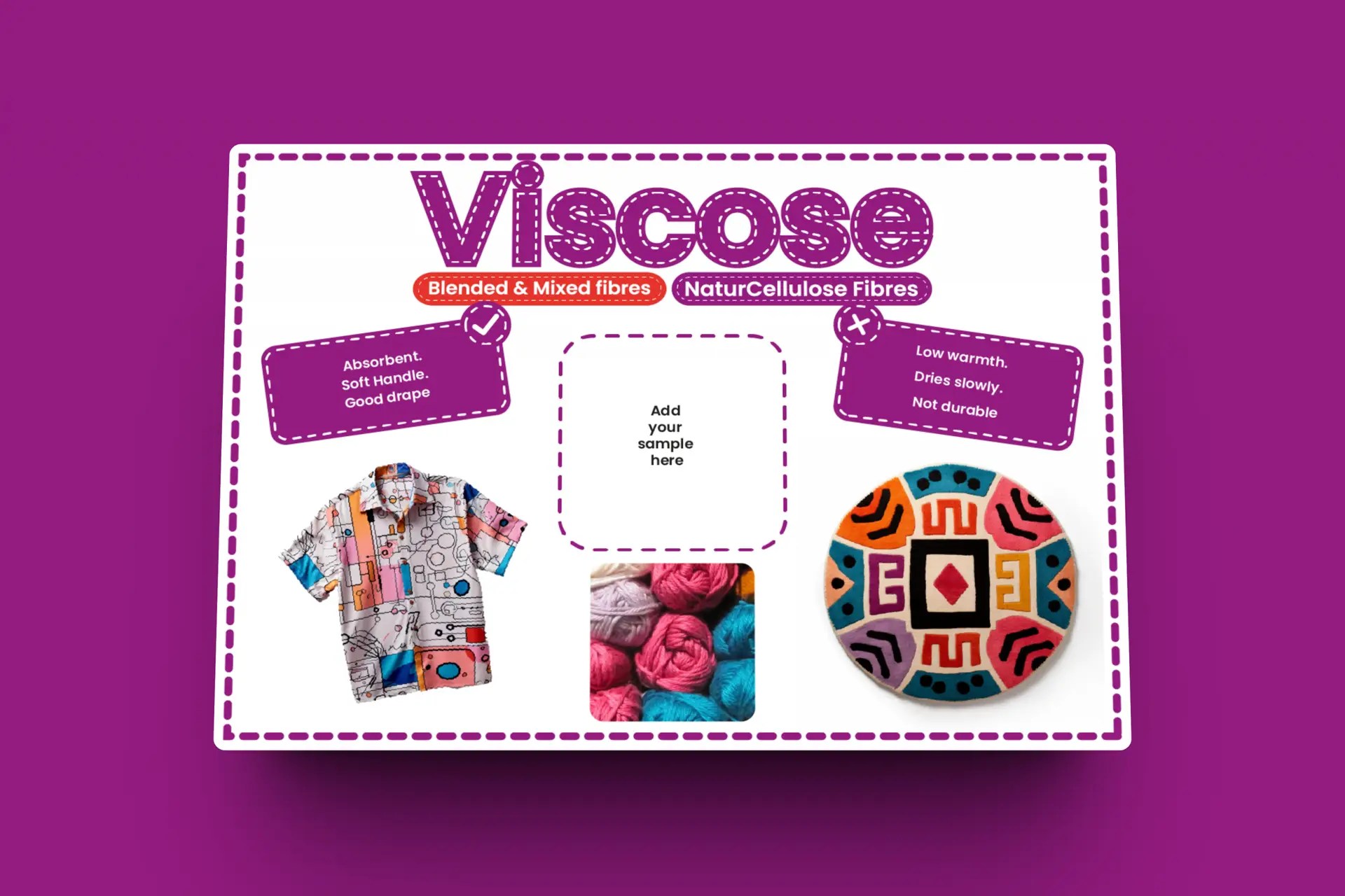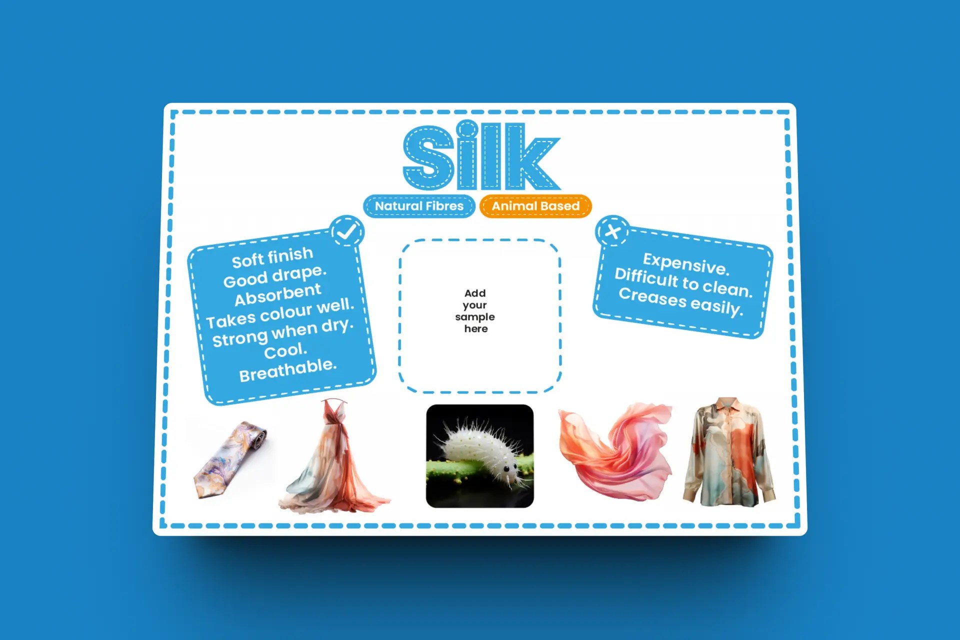 Just add your own swatch of each textile to make an informative and accessible display about a range of key textiles materials.