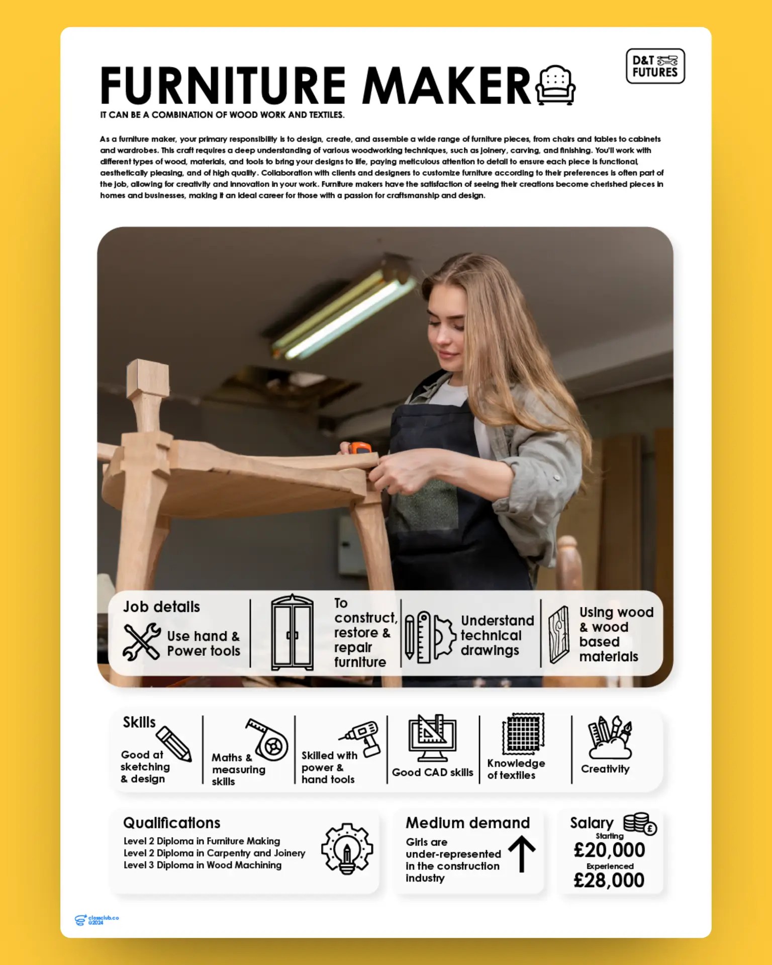 Covers 5 woodwork careers, including Carpenter, Joiner, Wood machinist, Furniture maker and Shopfitter.